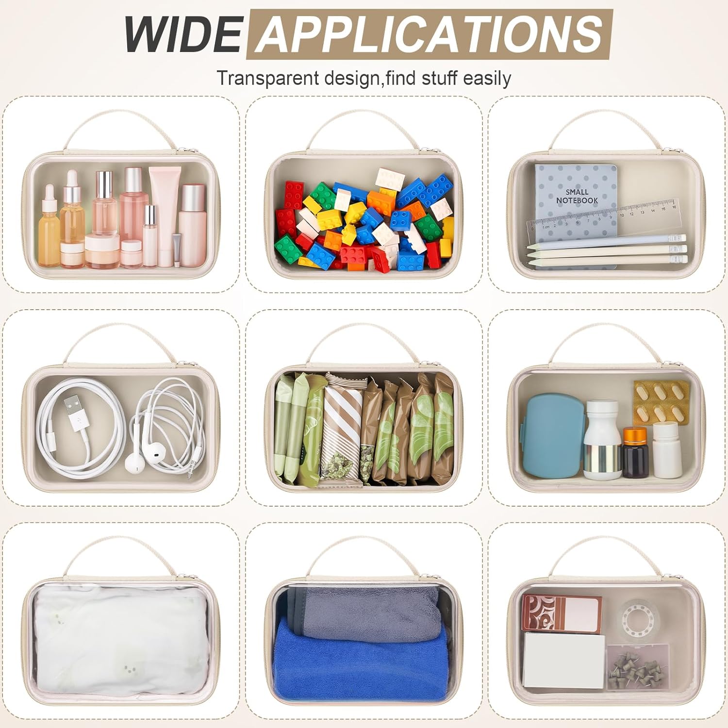 Features: Clear Visibility: The semi-transparent design lets you spot items quickly, eliminating the need to open each case to find what you need Multi-functional Use: These cases adapt to store different items, from cosmetics to office supplies, making them versatile organizers for any situation. Specifications: Material: PET, EVA Color: beige Size: 20 x 13 x 6 cm Package includes: 3 x Clear makeup bags with zipper Notes: Manual measurement, please allow slight errors on size. The color may exist a slight difference due to different screen displays.