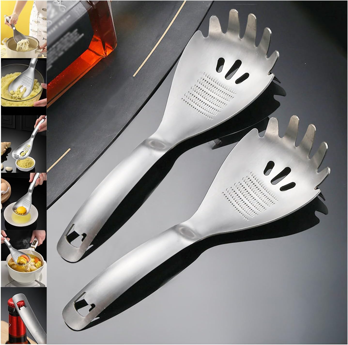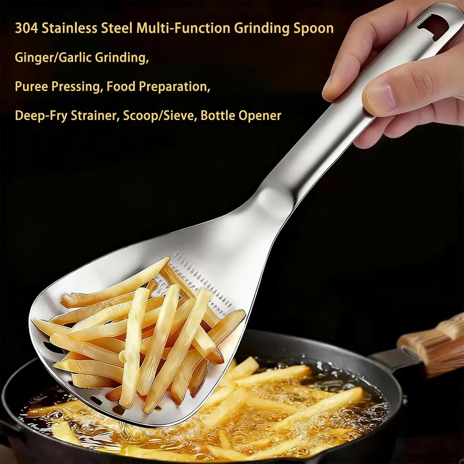 Specialty Cooking UtensilsThis dishwasher-safe tool serves as a potato masher, grater plate, colander, skimmer, bottle opener, and more, making it an indispensable addition to your kitchen gadget.1.Crafted from premium 304-grade stainless steel at 1.5mm thickness, this versatile tool combines Multiple essential kitchen implements into one space-saving utensil;2.The innovative design features 144 sharp teeth for efficient grating of garlic and ginger;3.While the 7 oval holes make it perfect for mashing potatoes and draining liquids from fried foods;4.The crescent-shaped hole design expertly separates egg yolks from whites, and the integrated bottle opener adds extra convenience;5.The curved handle ensures comfortable grip during use, while the one-piece molding construction guarantees durability;6.The hanging hole design allows for easy storage, while the professional-grade construction ensures long-lasting performance.Transform your kitchen tasks with this ingenious multifunctional cooking spoon.Streamline your cooking process and declutter your kitchen drawers with this thoughtfully designed multi-purpose utensil.